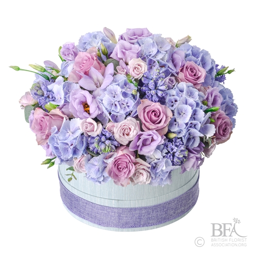 For a gift with a difference, this arrangement in a Hatbox is ideal. It is filled with sumptuous blues, mauve and soft pink flowers to provide a truly luxurious look.