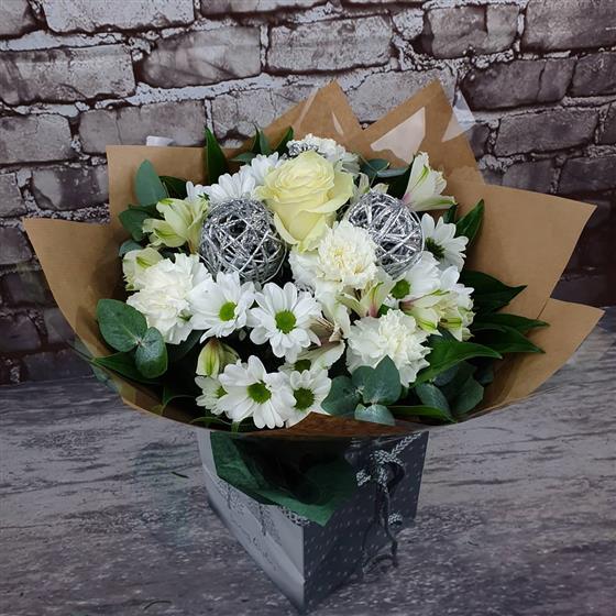 A crisp festive hand-tied arranged with elegant white blooms, glossy winter foliage and sparkling silver decorations for a fresh, modern Christmas look. A perfect seasonal gift filled with wintry charm and crafted with care by your local florist.