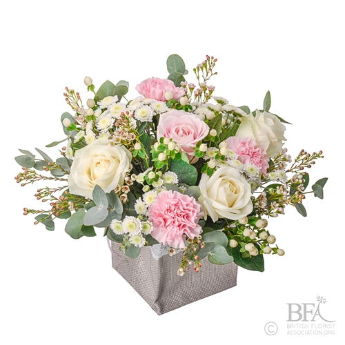 A soft and subtle arrangement of delicate pink and cream flowers arranged in a jute bag.
